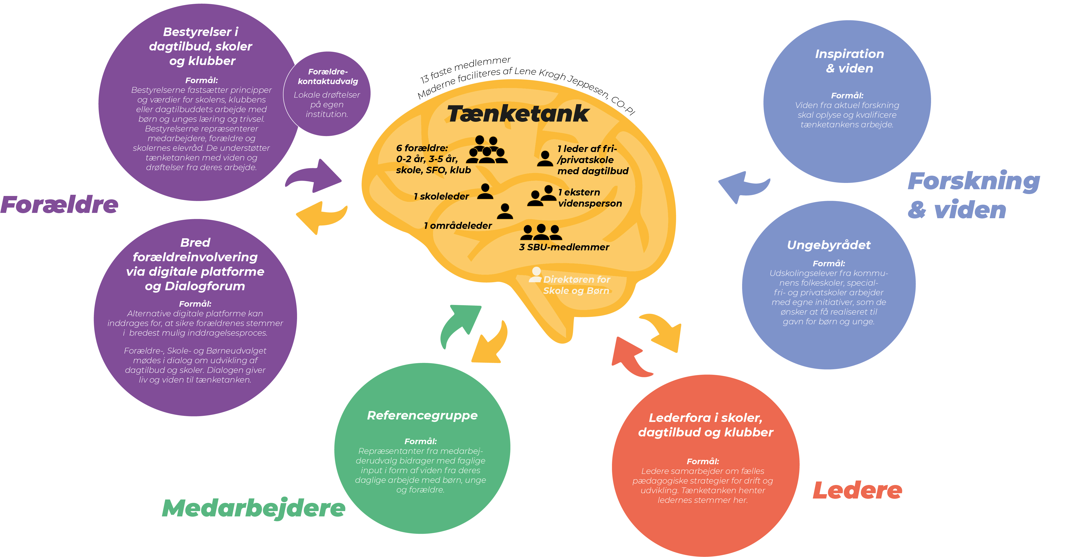 Tænketanken skal søsætte nye og uventede ideer med input udefra og komme med konkrete anbefalinger til Skole- og Børneudvalget. Anbefalingerne bør rumme og ramme fremtidens forældresamarbejde på både dagtilbud-, klub-, skole- og specialområdet.