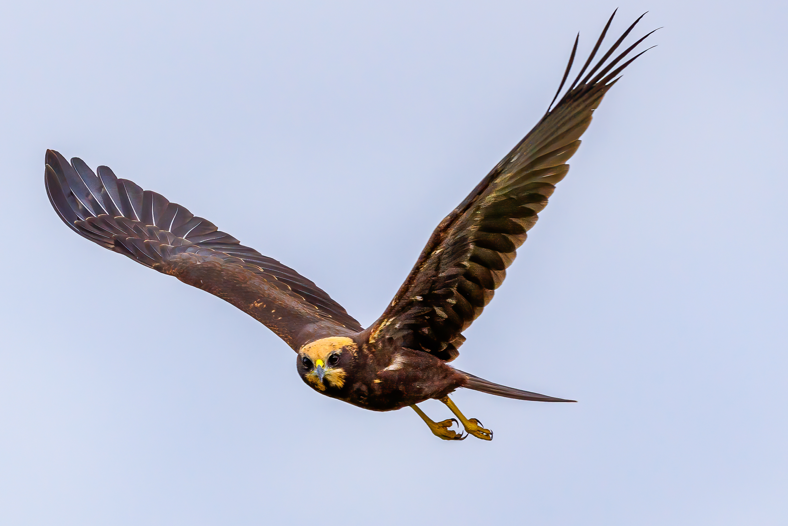 Rørhøge er kendetegnet ved, at vingerne holdes opad i v-form, når fuglen svæver.
