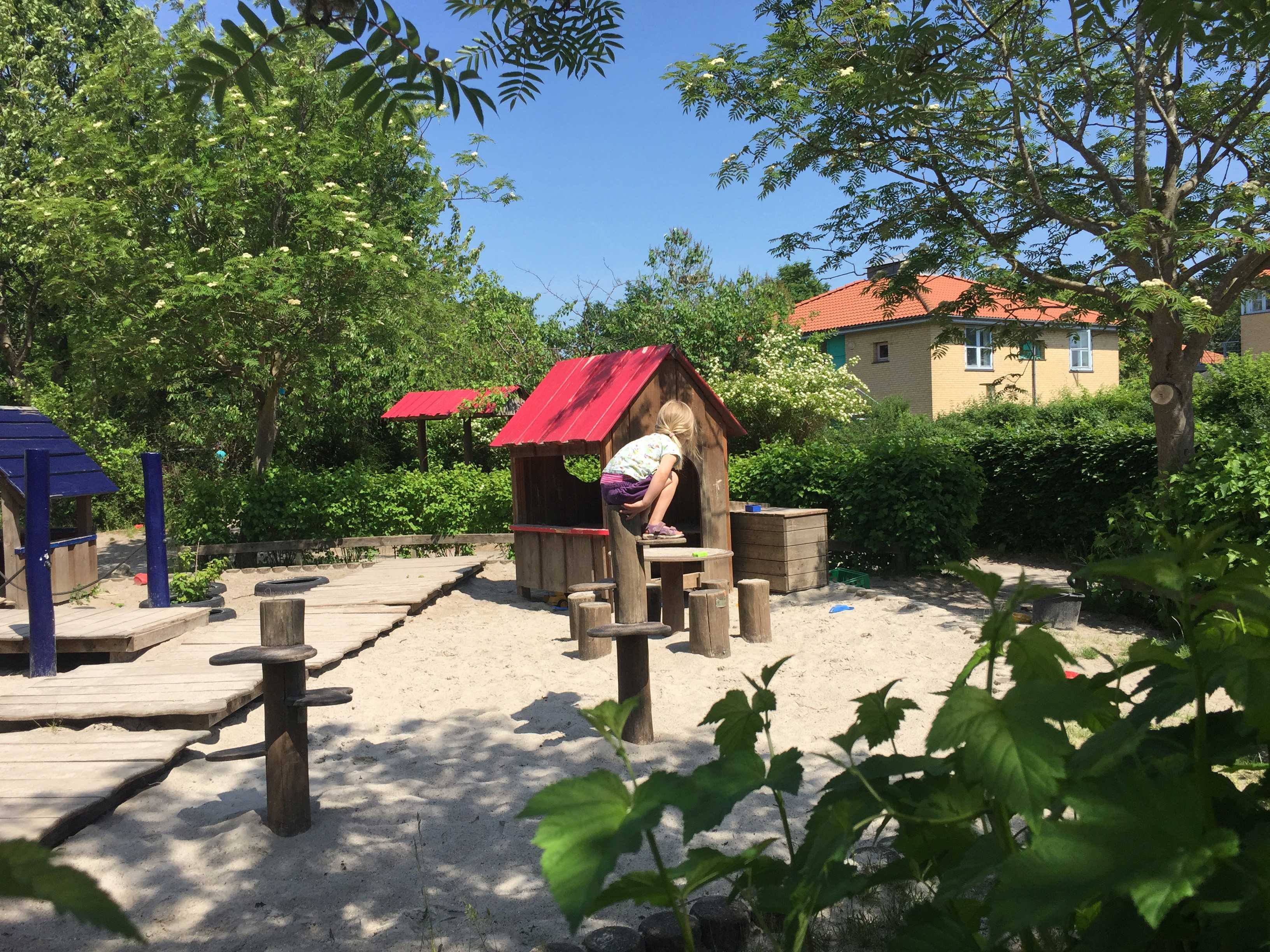 Vi har en masse kvadratmeter fyldt med sandkasser, legehuse, trampoliner, boldbane og troldeskov. Der er også bakker og blomster, og et mudderkøkken.