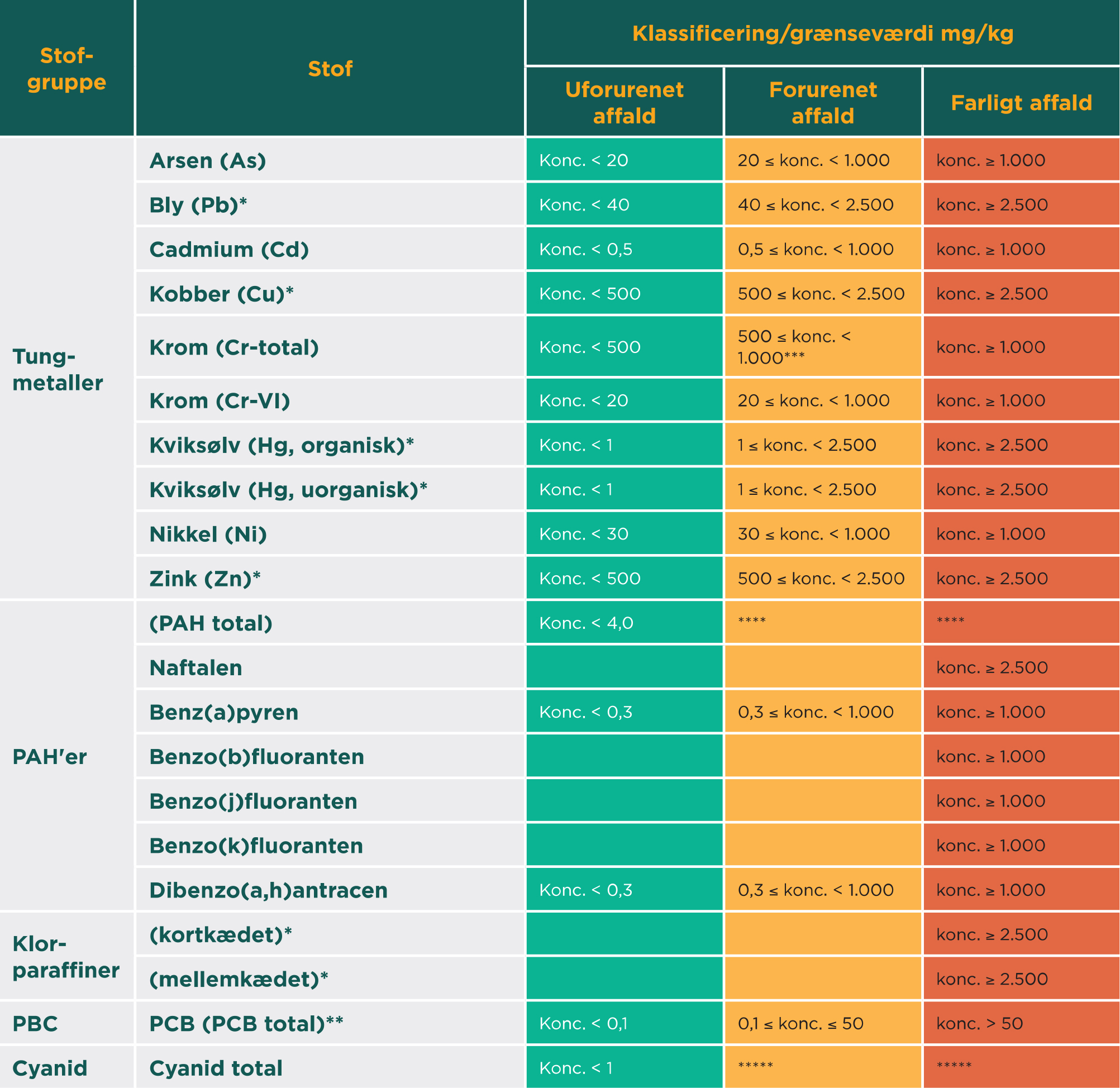 * Stofferne mærket med * er omfattet af summeringsreglerne for HP 14 ”Økotoks” gældende fra 5. juli 2018. Hvis koncentrationen af de enkelte stoffer er mellem 1.000 og 2.500 ppm skal de lægges sammen. Hvis den samlede værdi overstiger 2.500 ppm, er det farligt affald.
